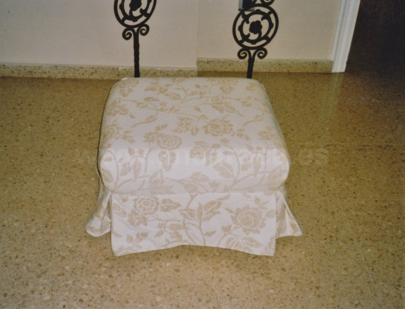 Funda para pouf con volante alto. El trabajo presentado se ha realizado con un tejido estampado de flores y volante alto para cubrir las patas del mueble con fuelles laterales.